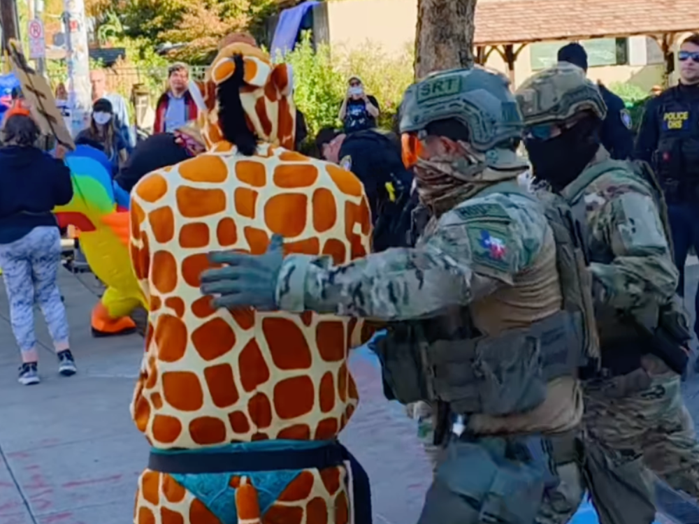 The recording shows the longtime music, culture, and comedy staple dressed in his usual tailed giraffe costume outside of the gated facility.