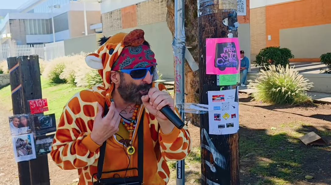 The recording shows the longtime music, culture, and comedy staple dressed in his usual tailed giraffe costume outside of the gated facility.